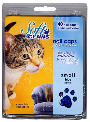 Soft Claws Nail Caps are a simple alternative to declawing when pet scratching is a problem. They are easy to apply and are perfect for cats of all ages. Soft Claws do not interfere with the normal extension and retraction of your cats claws. When applied to front paws, they reduce the potential for damage due to our cat's natural clawing and sharpening behavior. Kit contains: 40 nail caps, 2 tubes adhesive and glue applicator. Sizes: Kitten, small, medium and large and in color choices of purple, pink, clear, blue and red. Kitten comes in clear only. Most average size cats wear medium. If your cat is very small boned, choose the small size. Very large boned cats tend towards large. Kittens ususally are big enough to wear soft claws by 12 - 16 weeks of age. Directions: To test, try a nail cap on first without the adhesive. If it looks too big, don't glue it on. The nail cap should fit snugly, like a glove. The nail caps can also be trimmed to fit if needed. Kittens up to about 5 months of age and 5 pounds body weight generally fit into the kitten size.
